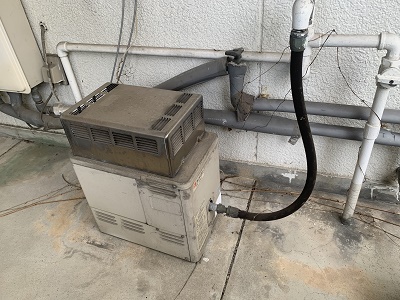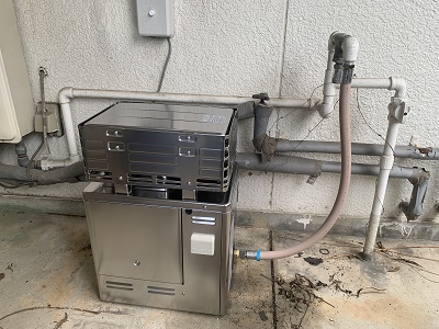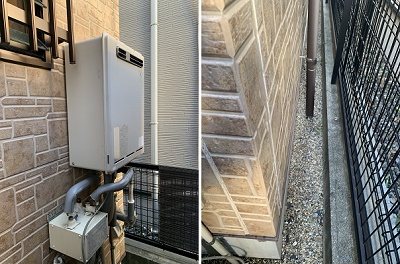 | 暖房熱源付給湯器から熱源なしの給湯器への交換です。 元々は床暖房の熱源も兼ねていましたが、使っていないとのことでお客様のご希望で熱源なしのものにしました。 本体の高さが低くなるので600サイズの配管カバーと配管延長が必要になりました。 |