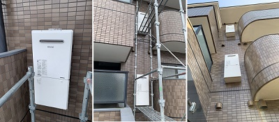 | 賃貸マンションオーナー様からのご依頼です。 給湯器5台、高所の大工事でした。 足場はお客様がご手配していただけたので費用は入っていません。 大量発注ということで通常は必要になる高所作業費はサービスとさせていただきました。 |