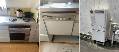 ビルトインコンロ、食器洗浄機、給湯器の一挙取り換えです。ビルトインコンロはトップの大きなガラストップのスマートコンロからの取替でした。 |