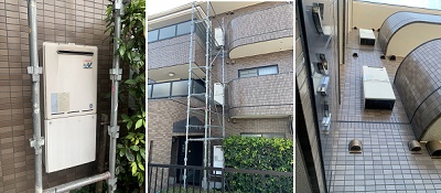 | 賃貸マンションオーナー様からのご依頼です。 給湯器5台、高所の大工事でした。 足場はお客様がご手配していただけたので費用は入っていません。 大量発注ということで通常は必要になる高所作業費はサービスとさせていただきました。 |