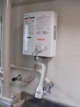 | 市営住宅のお風呂工事です。 FE式60φの排気筒が設置されていたので給湯器を設置して、 追焚なしシャワー付にしました。 室内用の排気筒のあるガス器具の設置には特監法という法律が 適用されるため工事者の資格も通常より難しいものが必要になります |